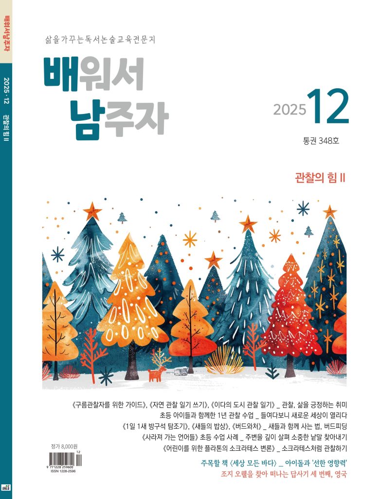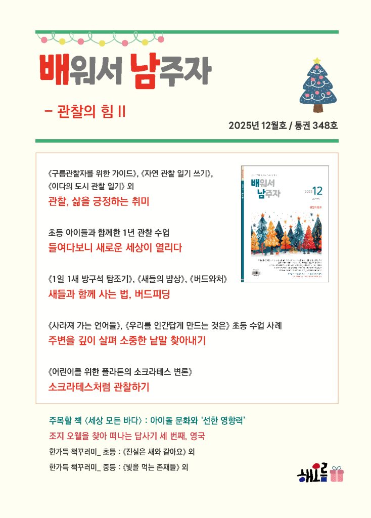 12월호 특집은, 11월호에 다루었던 ‘관찰’이란 개념을 자연물과 자연현상에서 더 나아가, 언어와 사고방식에까지 확장해 보았습니다. 흥미로운 책도 잔뜩 소개하고 1년내내 해볼 수 있는 활동도 소개했으니, 내년에 수업 짜실 때 ‘관찰’ 활동들을 꼭 넣어보세요! 단발성 수업보다는 반복할 수 있는 활동, 수업전후에 할 수 있는 지속적인 재밌는 활동들을 계획해보시면 좋겠습니다.