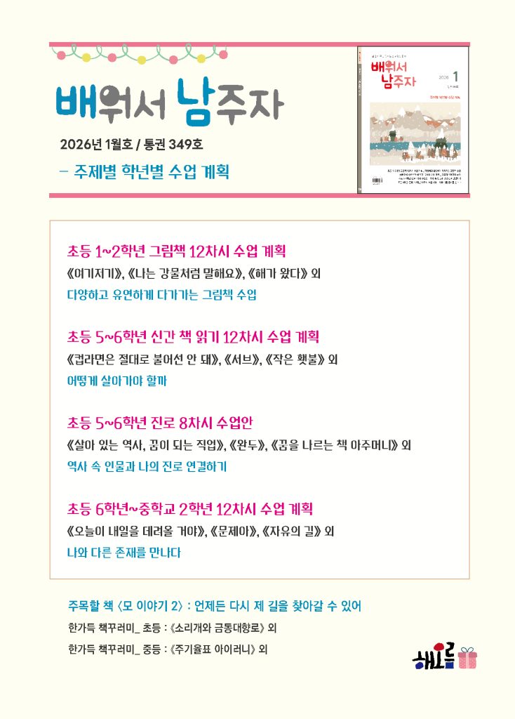 배워서 남주자 1월호는 매해 신년호마다 다루는 <주제별 학년별 수업계획> 특집으로 꾸몄습니다. 방학 기간 동안 한해 수업을 계획하고 수업안을 업데이트하셔야 하는 선생님들이 가장 많이 찾으시는 특집입니다. 이번에 발간된 <배남 특별호 : 2021-25 초등 수업계획 모음집>과 함께 보시면 정말 든든할 거라고 생각해요! 올한해도 배남을 아껴주신 여러분, 새해 복 많이 받으세요!