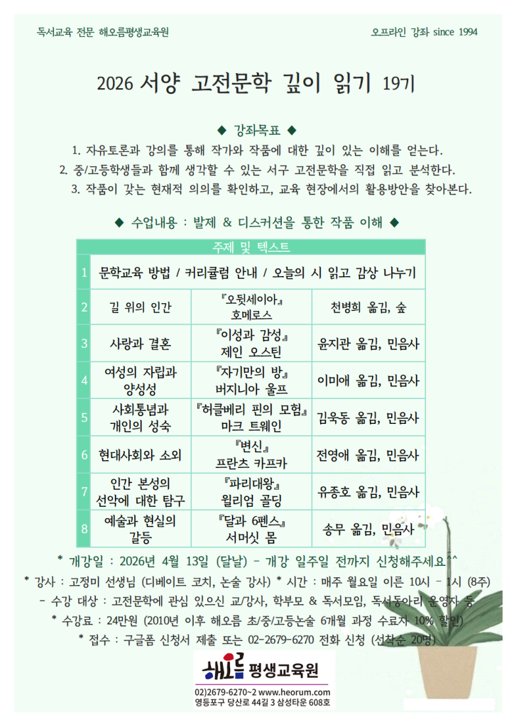 독서교육 전문 해오름에서 오는 4월 13일, 서양 고전문학 깊이 읽기 오프라인 강좌를 시작합니다~!