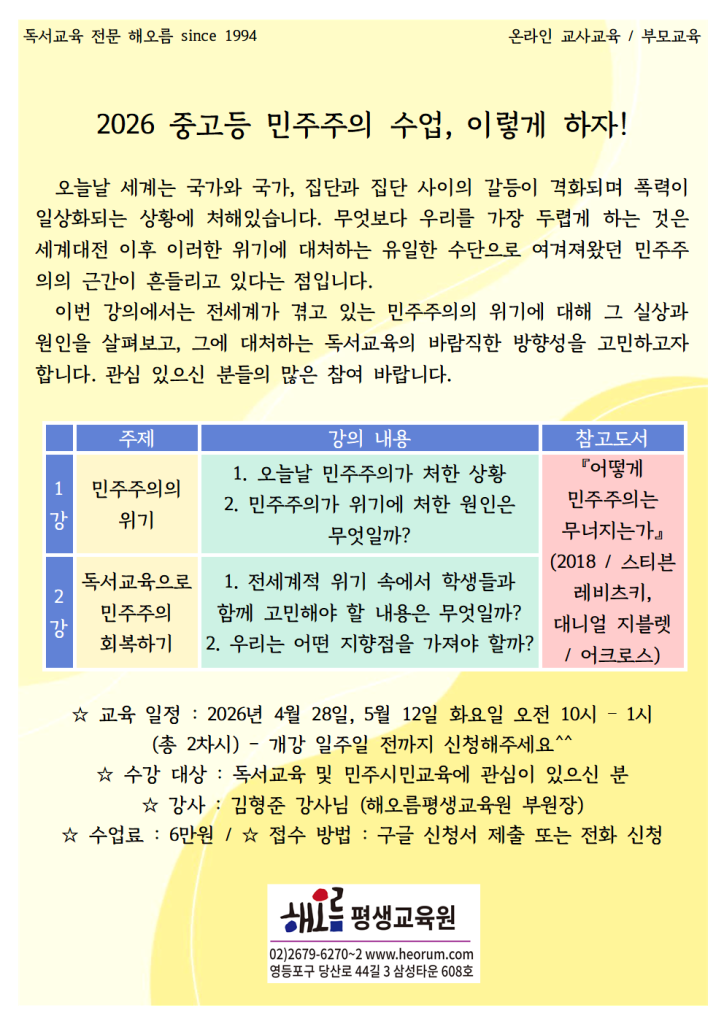 [온라인] 독서논술 교사를 위한 2026 민주주의 단기특강 (4/28)