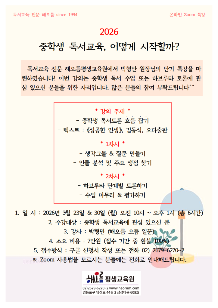 독서교육 전문 해오름에서 마련한 박형만 원장님의 단기 특강이 오는 3월 23일 개강합니다^^